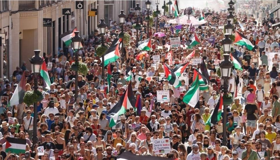 En Málaga la marcha ha partido al mediodía desde la plaza de la Merced y ha recorrido las principales calles del Centro de la capital. Con pancartas de «Paremos el genodicio en Palestina», los manifestantes han coreado «Netanyahu asesino» y «Las tierras robadas, serán recuperadas», entre otros esloganes.