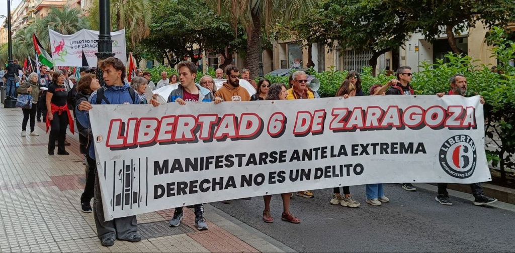 Cientos de personas se han lanzado este sábado a las calles de la capital aragonesa para pedir la libertad de los 6 de Zaragoza. Sindicatos, partidos políticos, organizaciones sociales y personas ni identificación con ningún colectivo han participado en una movilización que ha salido de la plaza del Portillo y ha finalizado frente a la Delegación del Gobierno en Aragón, en la plaza del Pilar.