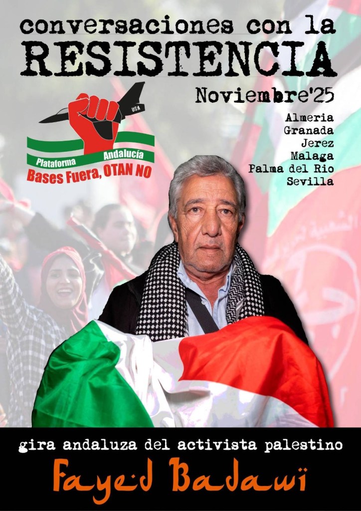 La Plataforma Bases fuera, OTAN NO de Andalucía organiza la próxima semana una gira por Andalucía del activista palestino Fayed Balawi bajo el título de «Conversaciones con la Resistencia».