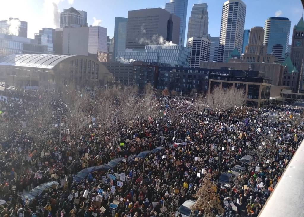 Miles de manifestantes salieron a las calles de Minneapolis este viernes pese a temperaturas de hasta -29 °C, en una jornada organizada como huelga general bajo el lema ICE OUT!, exigiendo el fin del despliegue federal de inmigración ordenado por la administración del presidente Donald Trump. Según los organizadores, unas 50.000 personas participaron, aunque la policía local no ofreció estimaciones oficiales. Más tarde, cientos se reunieron en el Target Center, un estadio con capacidad para 20.000 personas, que estaba más de medio lleno, según Reuters.