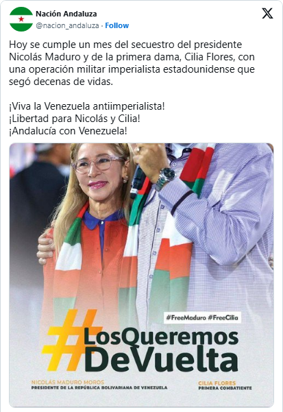 Tras un fin de semana andaluz de solidaridad con Cuba gracias al Encuentro internacional celebrado en Sevilla, donde estuvo muy presente el acoso imperialista a Venezuela, el partido independentista y socialista Nación Andaluza publicó ayer en sus redes sociales un post donde recordaba que «Hoy se cumple un mes del secuestro del presidente Nicolás Maduro y de la primera dama, Cilia Flores, con una operación militar imperialista estadounidense que segó decenas de vidas. ¡Viva la Venezuela antiimperialista! ¡Libertad para Nicolás y Cilia! ¡Andalucía con Venezuela!».