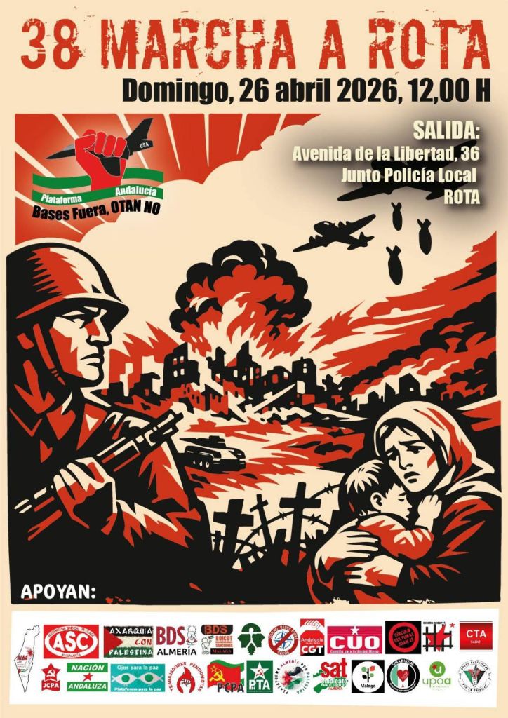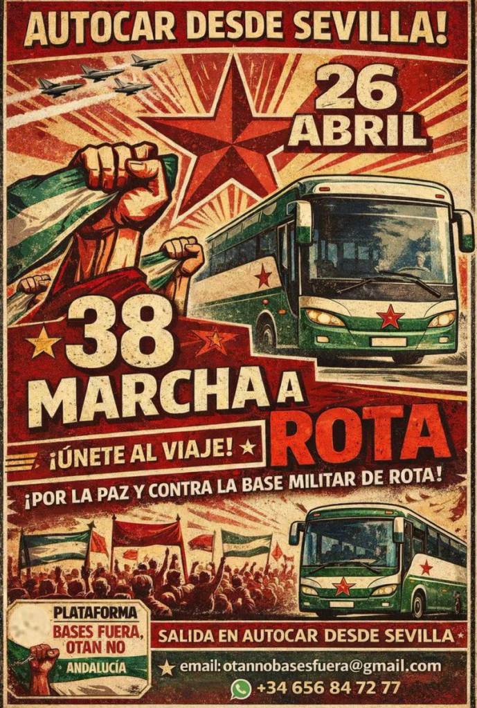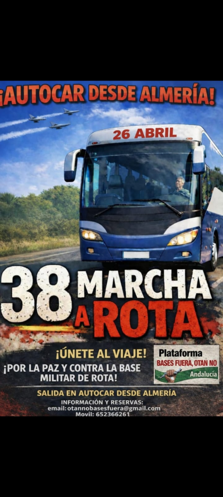 Desde toda Andalucía se ajustan estos días los preparativos para la marcha contra la base militar de Rota que se celebrará el próximo domingo 26 de abril. Almería, Granada, Córdoba, la Axarquía, Málaga y Sevilla son los lugares desde los que hay organizado transporte colectivo hasta la marcha.